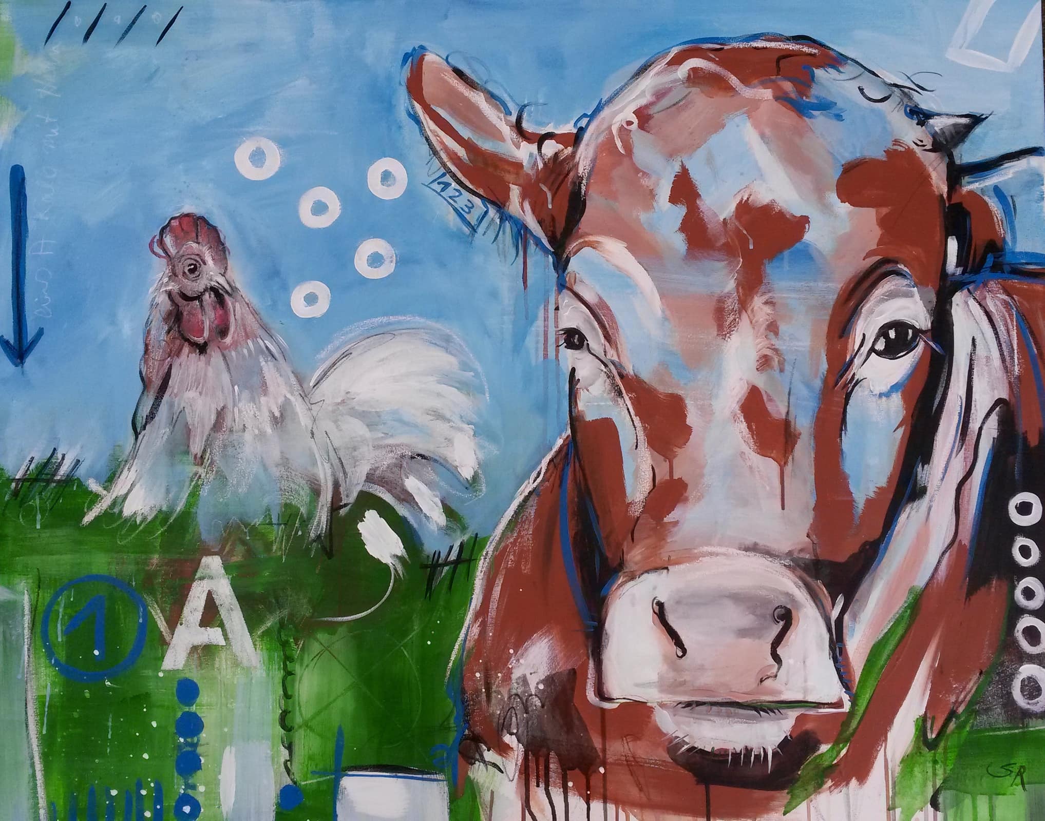 In der Werkserie „Kühe codiert” entstehen neue Arbeiten. Alle Gemälde entstehen auf Leinwand auf Keilrahmen gespannt, gemalt mit Acrylfarben. Außerdem nutze ich gerne andere Materialien in Mischtechnik wie z.B. Kreie, Ölkreide und Kohle. Alle Bilder sind expressiv gemalt. Das Bild „1A Kalb mit Hahn” hängt gerade bei mir im Wohnzimmer zum Testen… klasse Wirkung.