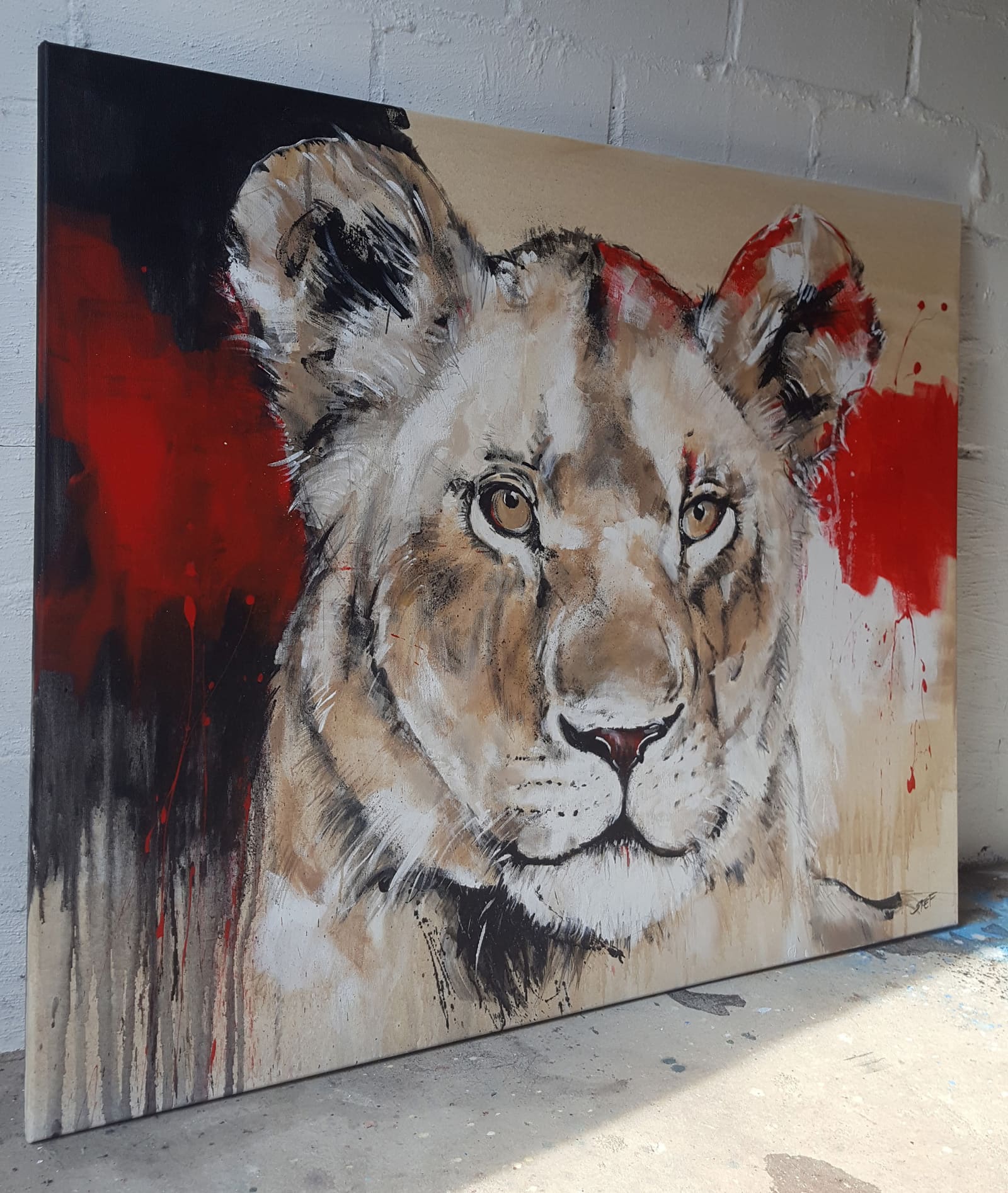 Sie hatte die letzten Arbeiten der Großkatzen, den Löwen und den Leoparden gesehen und sich eine Löwin gewünscht. Das war eine wunderschöne Herausforderung, die ich gerne angenommen habe. Ohne große Vorgaben, nur mit der Bitte, in dem Farbspektrum der bisherigen Großkatzen zu bleiben, durfte ich an die Arbeit gehen. Herausgekommen ist ein Charakterkopf in erdigen Tönen kombiniert mit sprühendem Rot. Dieses Werk ist in Acrylfarben und Graphit auf 100 x 80 cm Leinwand entstanden.
