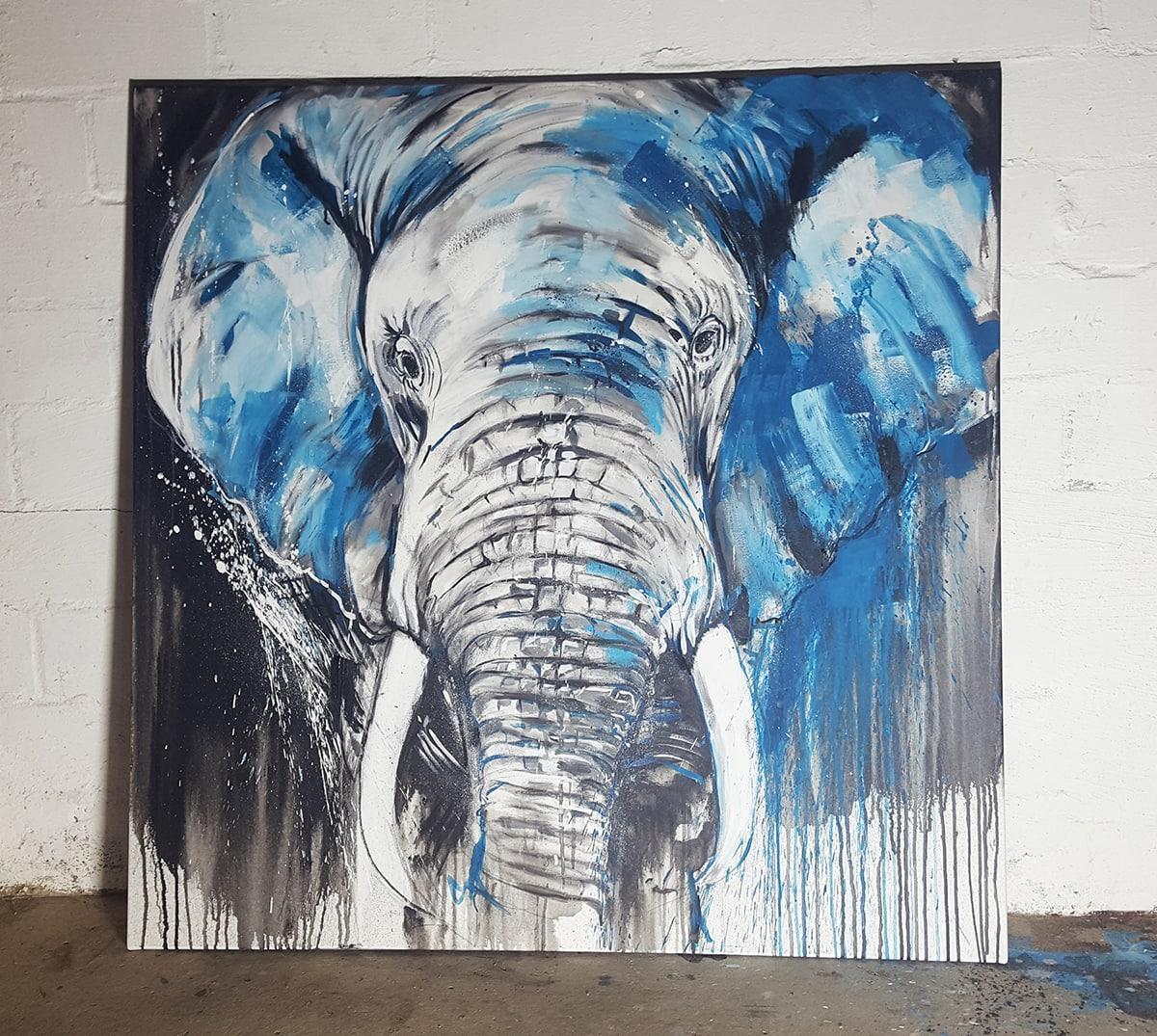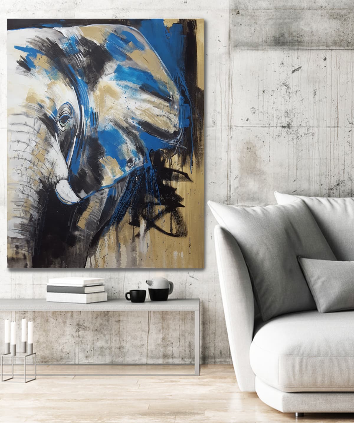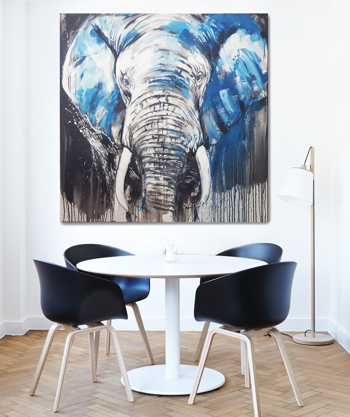- Großes Gemälde „Elefant No 5” in Raumansicht, 100 x 100 cm auf Leinwand, expressiv gemalt, Unikat