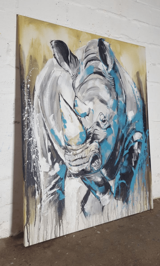 In der  Serie „One of the big five” ist gerade eine neue Arbeit entstanden. Expressiv auf 80 x 100 cm Leinwand in reduzierter und trotzdem sehr lebendiger Farbgestaltung. Ocker, Lichtgrau, Graphite und Türkis wird das Nashorn lebendig.