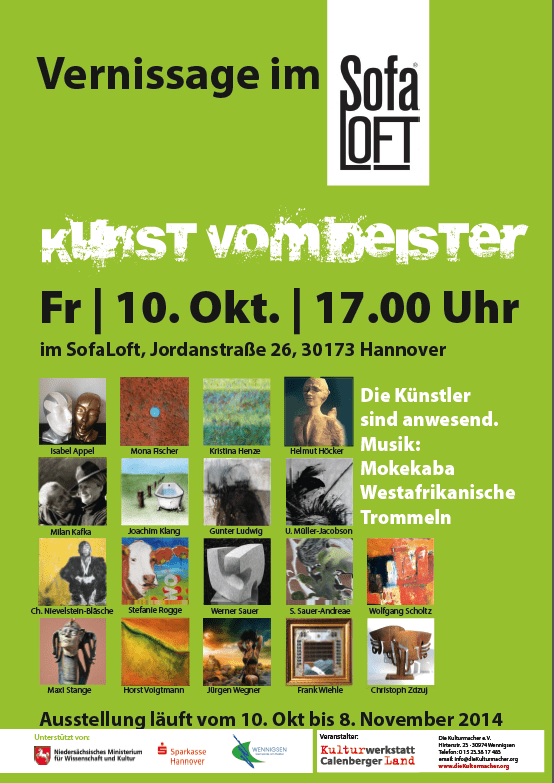 Allgemein Kunst vom Deister im Sofa Loft Veröffentlicht 10. Oktober 2014 Die Ausstellung Kunst vom Deister im SofaLoft Hannover läuft noch bis zum 8. November…