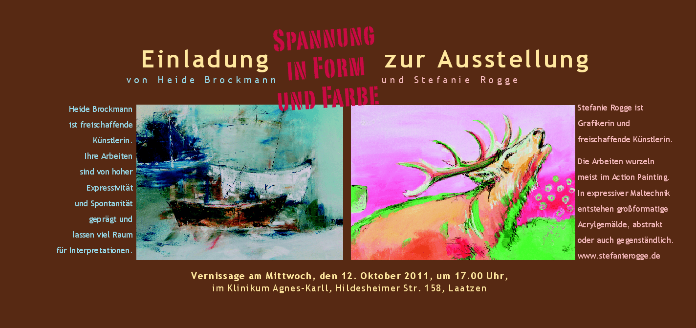 … findet am 12. Oktober in Laatzen statt. Ich freue mich, dass ich mit Heide Brockmann zusammen ausstellen kann. Die Gemeinschaftsausstellung trägt den Namen „Spannung in Form und Farbe”.
