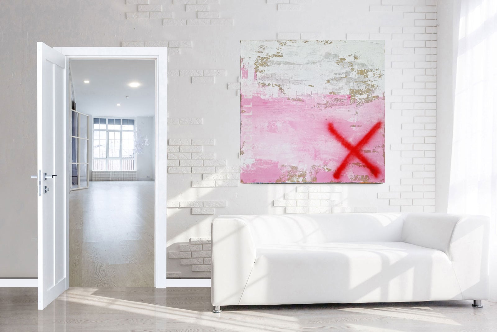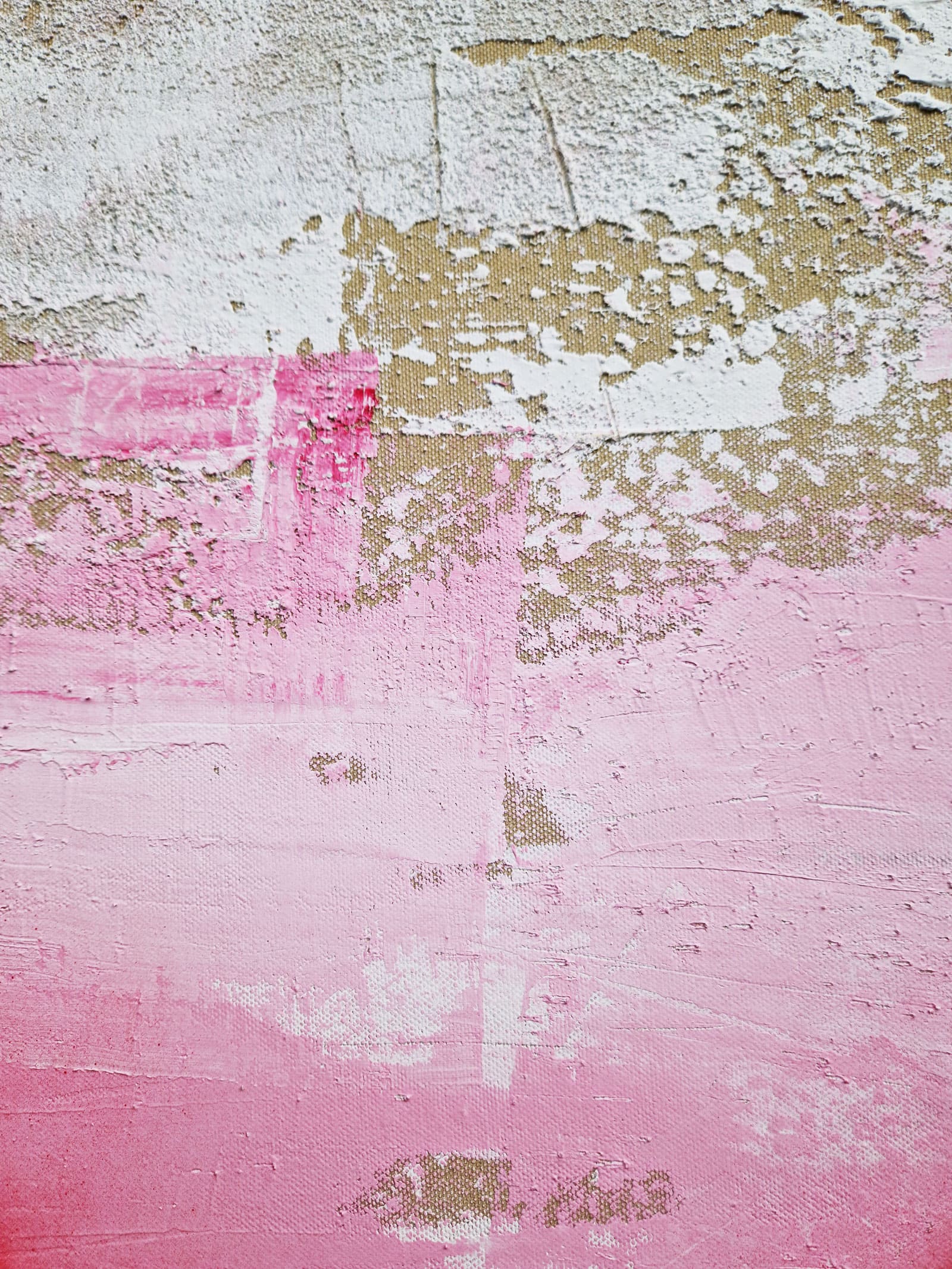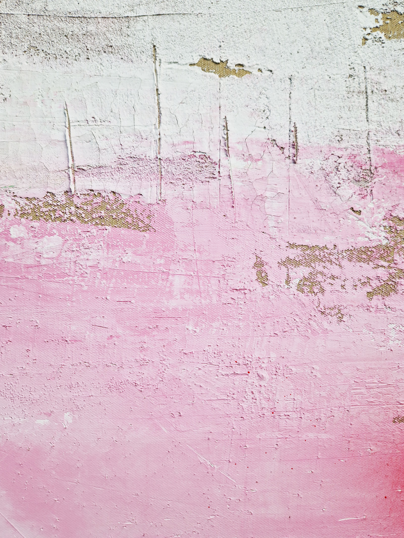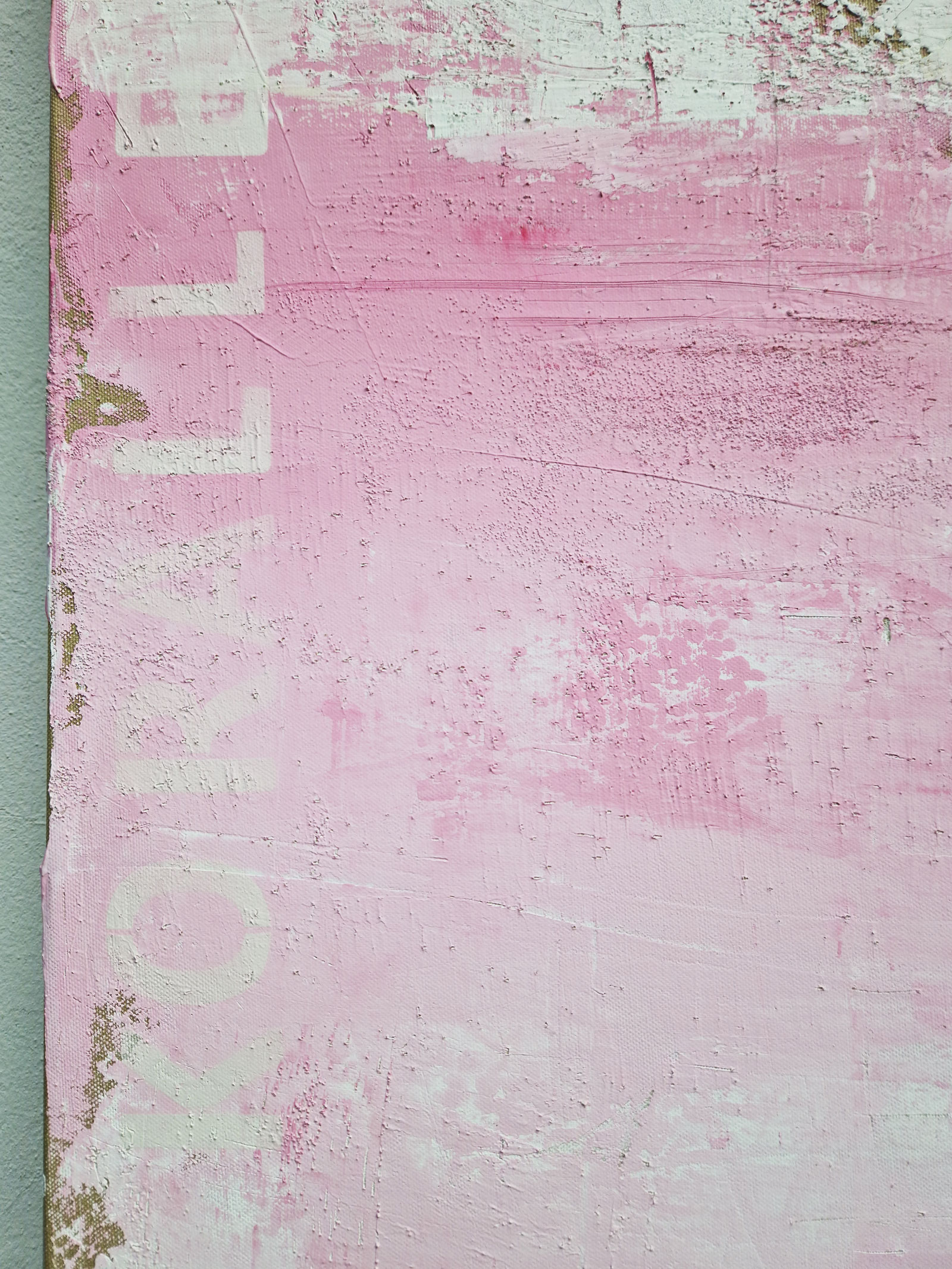 KORALLE – ein abstraktes rosa Bild mit typografischen Elementen auf großformatiger Leinwand