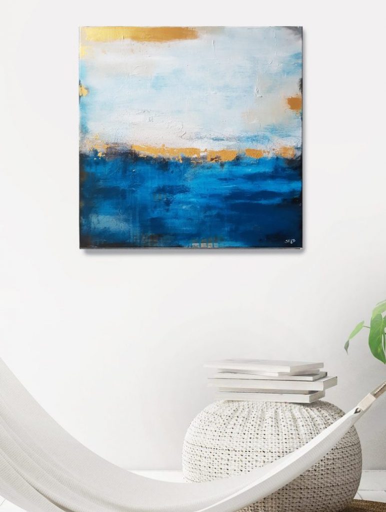 KÜSTENLICHT #2 ist ein abstraktes Wandbild, ein Stück vom Meer in blauen und goldenen Farben.