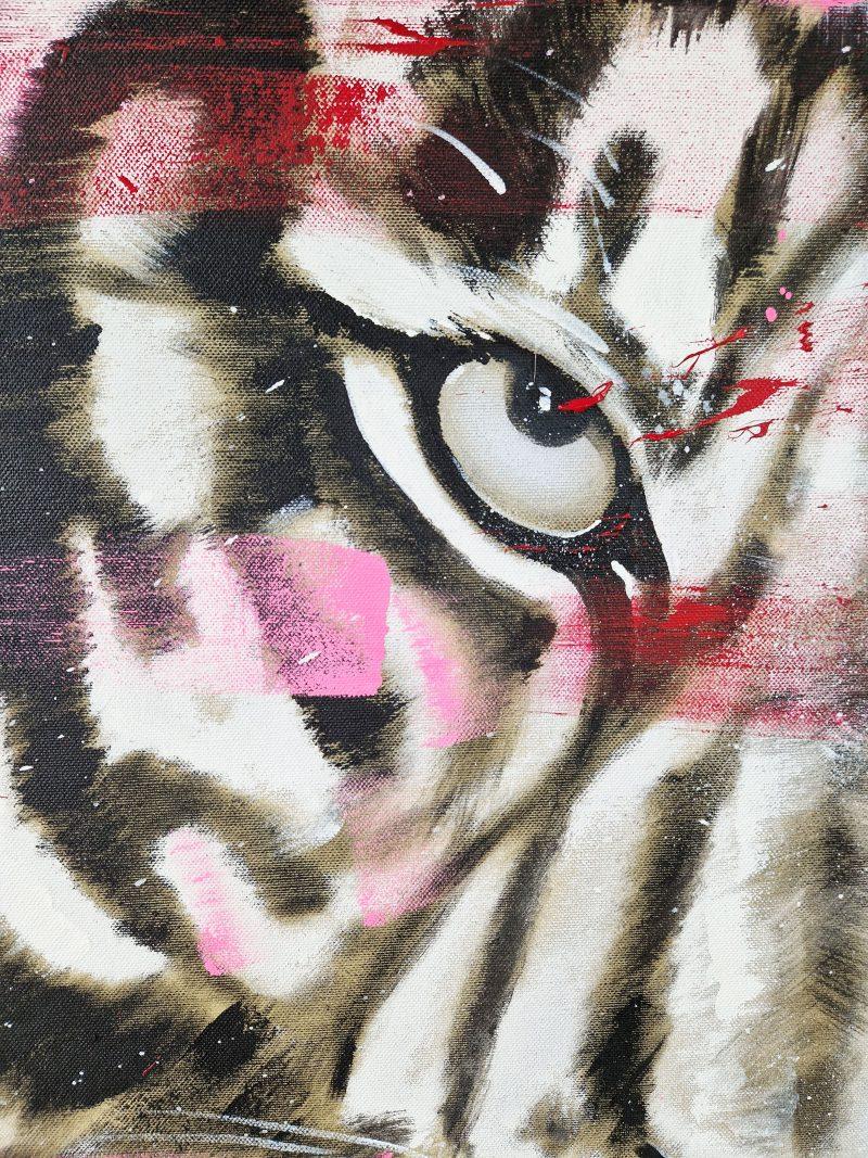 Das Gemälde Tiger #10 ist auf roher Leinwand gemalt und auf Keilrahmen gespannt.