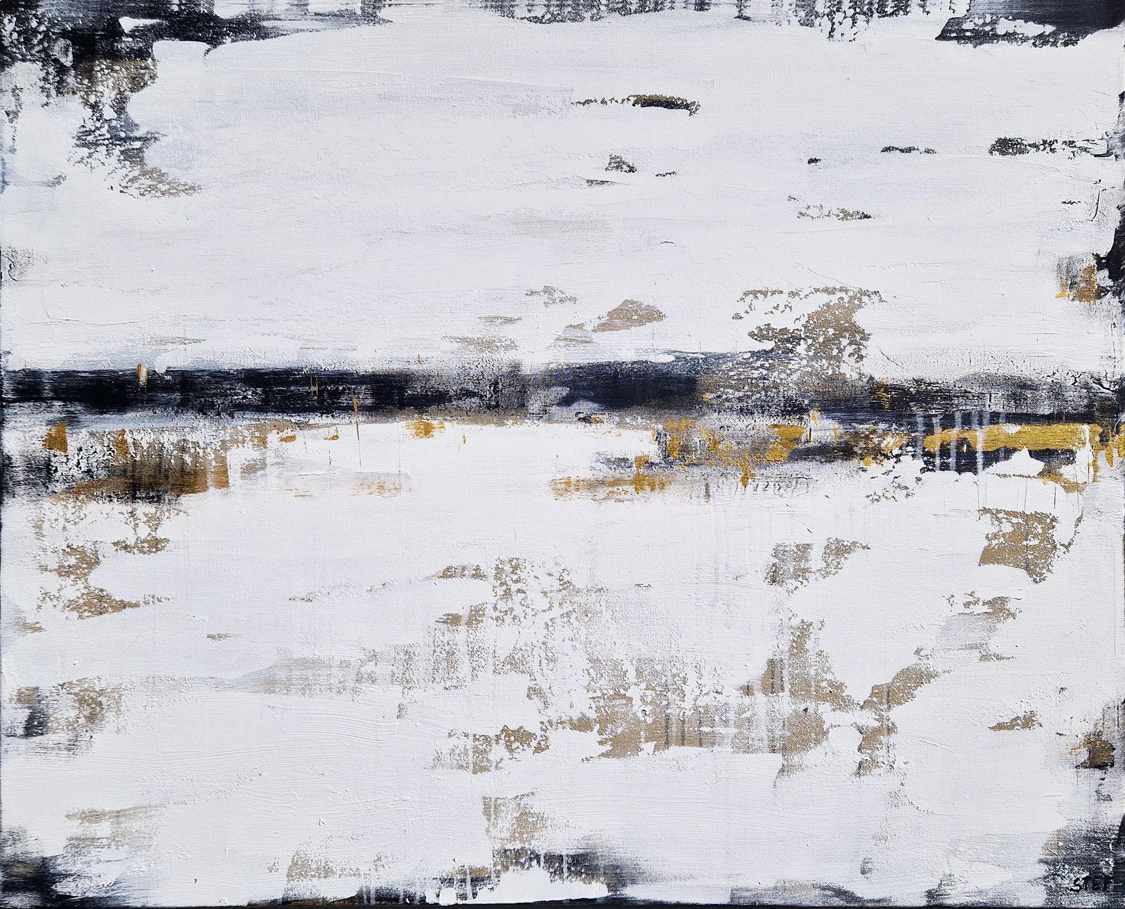 Ein abstraktes Gemälde auf roher Leinwand. Ein Unikat mit Gold, Weiß und Schwarz.