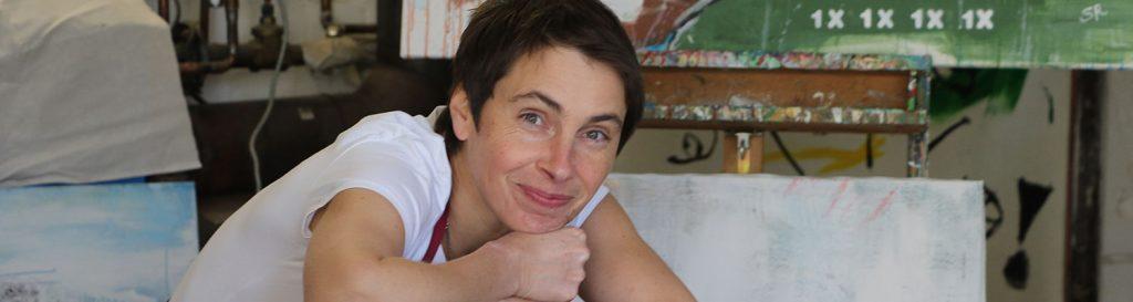 In Ihrem Atelier entstehen neben abstrakten Werken auch viele figurative Arbeiten. Die abstrakten großformatigen Arbeiten sind meist von der Küstenlandschaft inspiriert, von dem Licht, den Farben und den rauen Klippen. Gerne nutzt sie hier auch Collagetechniken, die Materialien wie Leinen und Wellpappe enthalten. Mit Schichten und Lasuren spürt sie den Charme dieser Landstriche auf.